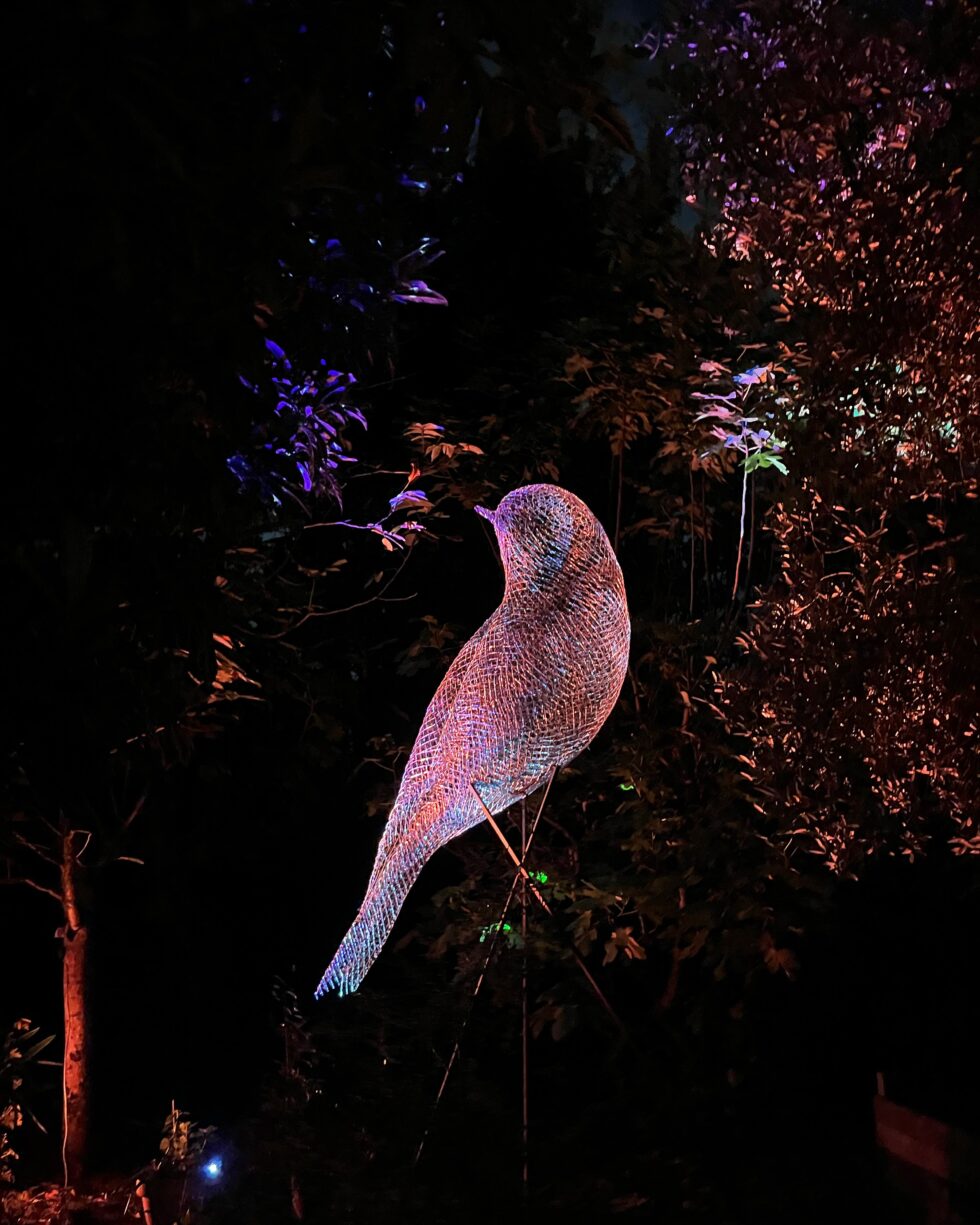 Dans d’autres espaces, les œuvres de Cédric Le Borgne — deux anges gris suspendus et un oiseau lumineux — introduisent une touche contemplative, presque méditative. Ce parcours à sensations fait passer le visiteur de la fantaisie mécanique à la poésie suspendue.
