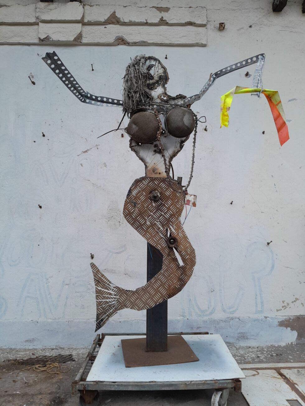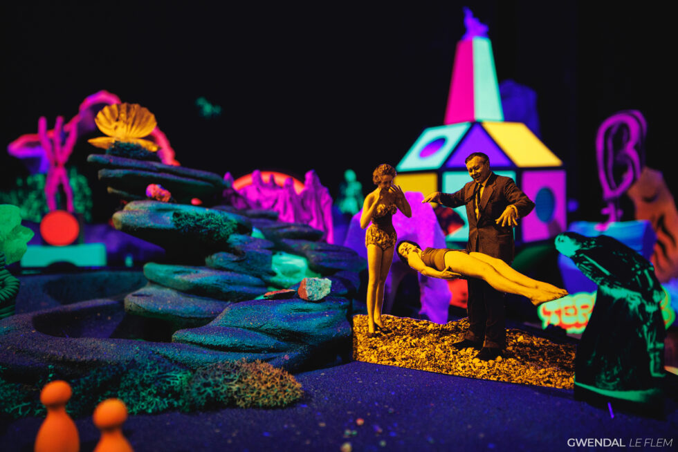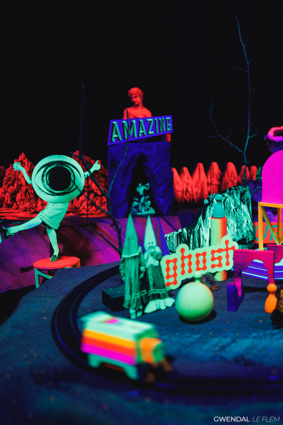 Dans la chapelle, le visiteur découvre les créations de l’artiste strasbourgeois Daniel Depoutot. Un monde d’automates, de silhouettes articulées, de masques mouvants et de squelettes qui semblent rire sous cape. Non loin, le Train Fantôme du duo de plasticiens scénographes Maculon Poligra déroule ses lumières fluorescentes : le visiteur est invité à une fête foraine miniature, étrange, colorée, hypnotique.