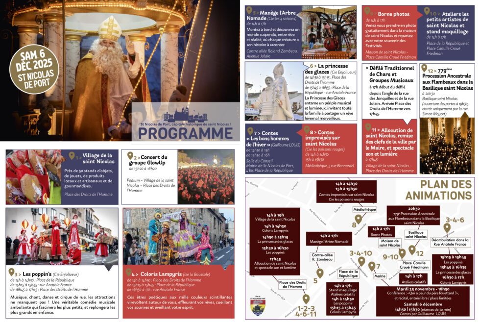 Le jour J, la ville s’animera dès 14h avec, sur la place des Droits de l’Homme, un village de la saint Nicolas rassemblant près de trente stands d’artisans, de producteurs locaux et de créateurs. L’odeur du pain d’épices se mêlera à celle du chocolat chaud, pendant que les compagnies de rue déploieront leurs spectacles poétiques et colorés : la Princesse des Glaces entamera son périple musical, les Coloris Lampyris égayeront les rues de leurs costumes aux mille couleurs, et les Poppin’s feront danser petits et grands.