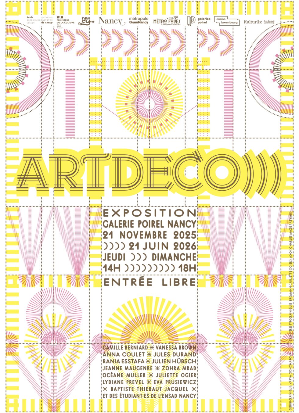 Avec le musée des Beaux-Arts de Nancy, le Casino Luxembourg – Forum d’art contemporain, dont le commissariat est assuré par son directeur, Kevin Muhlen, et avec le soutien de la Ville de Nancy, de la Métropole du Grand Nancy et de Kultur I Lx – Arts council Luxembourg, l’exposition ARTDECO))) labellisée Métro’Folies, met en lumière la vitalité de la création émergente au travers des productions de neuf jeunes artistes diplômés de l’Ensad Nancy.