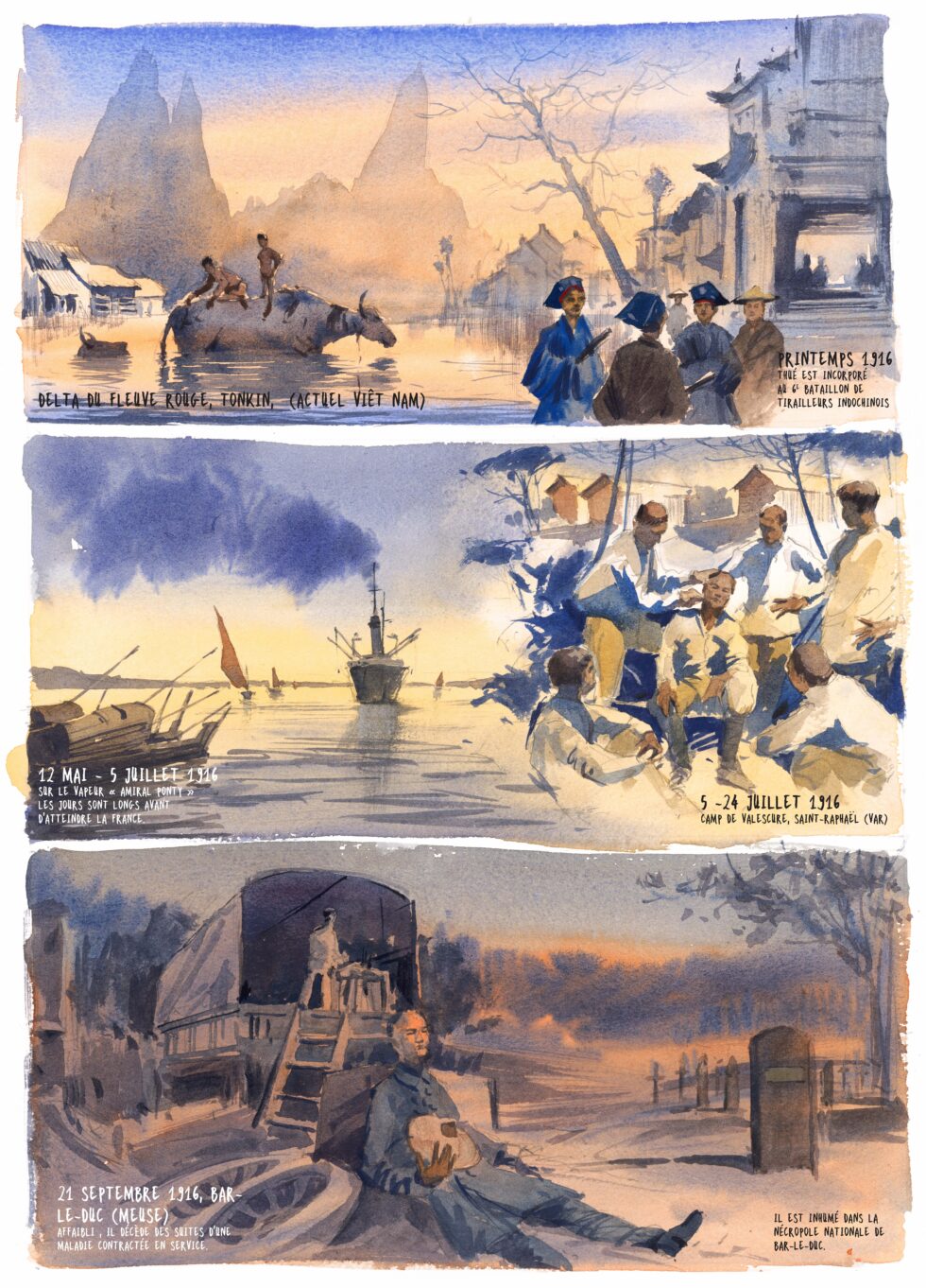 Pour donner corps à ces trajectoires, l’exposition s’appuie sur une grande diversité de supports. Des planches illustrées, spécialement dessinées pour l’occasion par l’illustrateur franco-allemand Timo Bechert, donnent à voir une interprétation contemporaine de ces parcours, tandis que des objets – uniformes, correspondances, effets personnels – rappellent la réalité concrète de ces existences bouleversées par la guerre. À ces éléments s’ajoute un dispositif sonore immersif permettant d’entendre des lettres ou des témoignages, offrant une plongée sensible dans le quotidien du front.