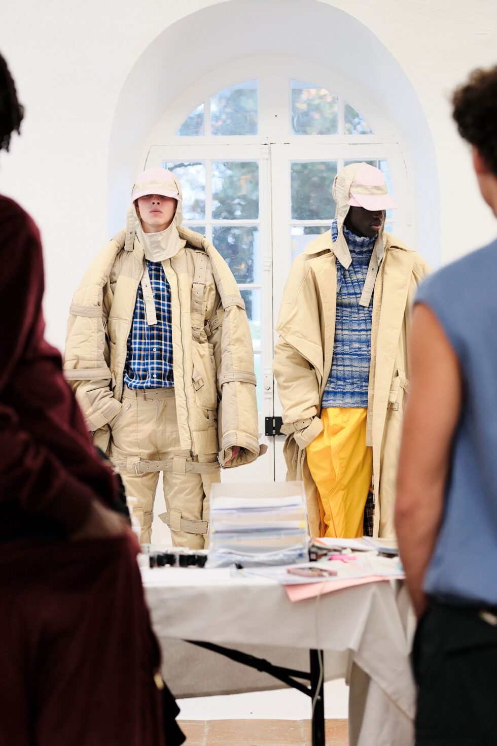 C’est vraiment la création : partir de rien et concevoir. Ce qui m’inspire dans mes créations varie à chaque saison. Pour cette collection, tout démarre d’un artiste contemporain qui s’appelle Martino Gamper, qui est un designer d’intérieur. Il réalise des chaises, des tables, des tapis… Il a un grand panel de production d’articles d’intérieur. Je me suis concentré notamment sur ses chaises, parce qu’il a fait une exposition qu’il a appelée « 100 chaises en 100 jours ». J’en ai fait une analyse qui m’a ensuite permis d’en retirer des gestes, des principes, des concepts que j’ai réadaptés à un vocabulaire vestimentaire. Par exemple, il y a une notion d’hybridation très forte dans son travail : il utilise deux typologies de chaises qui sont assez différentes et qu’il va venir unifier par des liens. Comme la rencontre entre une doudoune et un trench coat. Plus largement, je l’ai amenée à la rencontre entre un vestiaire technique propre à la montagne et un vestiaire contemporain masculin. Il y a aussi un aspect technique : une grosse partie des vêtements sont construits en un seul élément de patronage. C’est ce rapport technique et créatif que j’apprécie.