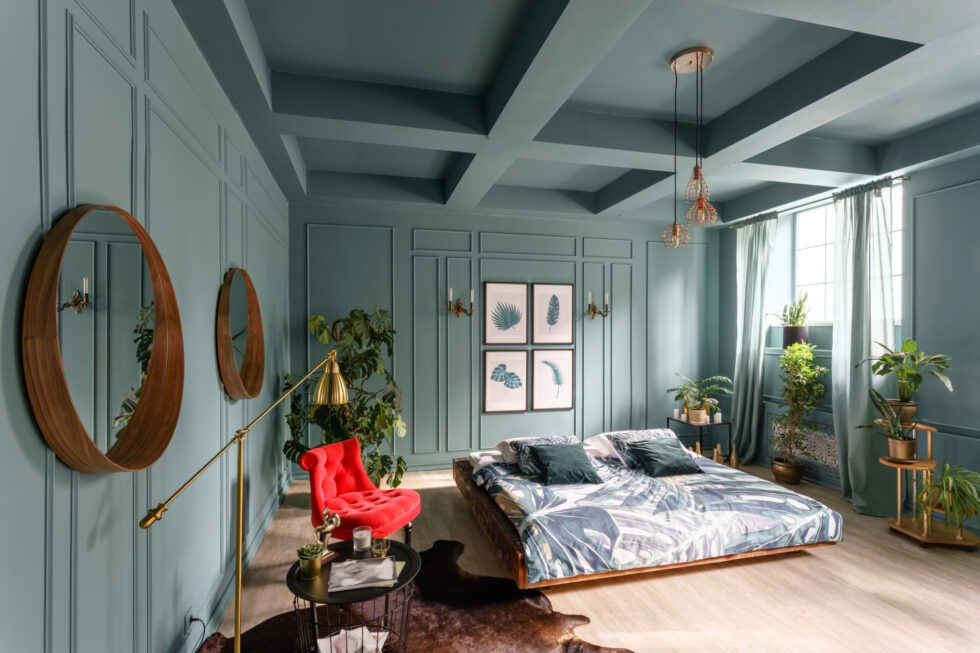 Utiliser la peinture et la couleur pour structurer un espace est une technique vieille comme le monde ! Quelques coups de pinceau suffisent en général à pimper sa décoration. L’astuce la plus classique est évidemment celle d’un aplat de couleur sur un seul pan de mur pour dynamiser une pièce, que ce soit dans le salon, la cuisine ou la chambre. Mais une autre méthode permet d’apporter encore plus d’originalité : c’est l’effet boîte. En prolongeant la peinture du mur au plafond ou sur les murs attenants, cette technique va délimiter visuellement l’espace et le structurer. L’effet boîte va ainsi « encadrer » la pièce.