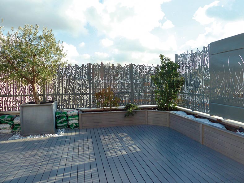 Les terrasses ne donnent pas toujours sur des jardins, mais, même sans espace, rien ne vous empêche de créer le vôtre… à la verticale ! Les murs végétaux s’installent maintenant de plus en plus facilement. Il existe même des kits destinés à vous faciliter la pose. Les bambous grandissent également très vite, selon les variétés, et peuvent créer en quelques saisons un décor exotique : il suffit de les planter dans des pots suffisamment solides pour contenir leurs racines dont la vigueur a vite fait de percer les contenants trop fragiles. De manière plus simple, il est facile d’accrocher quelques pots de fleurs contre une cloison, qu’elle soit en bois ou en parpaings, pour apporter une touche de nature à un espace trop minéral. Il existe également des panneaux végétaux d’aspect très naturel, composé par exemple de branches de bois tressées. Ils apportent un aspect rustique aux terrasses tout en laissant davantage passer le jour et la lumière que des panneaux entièrement opaques.