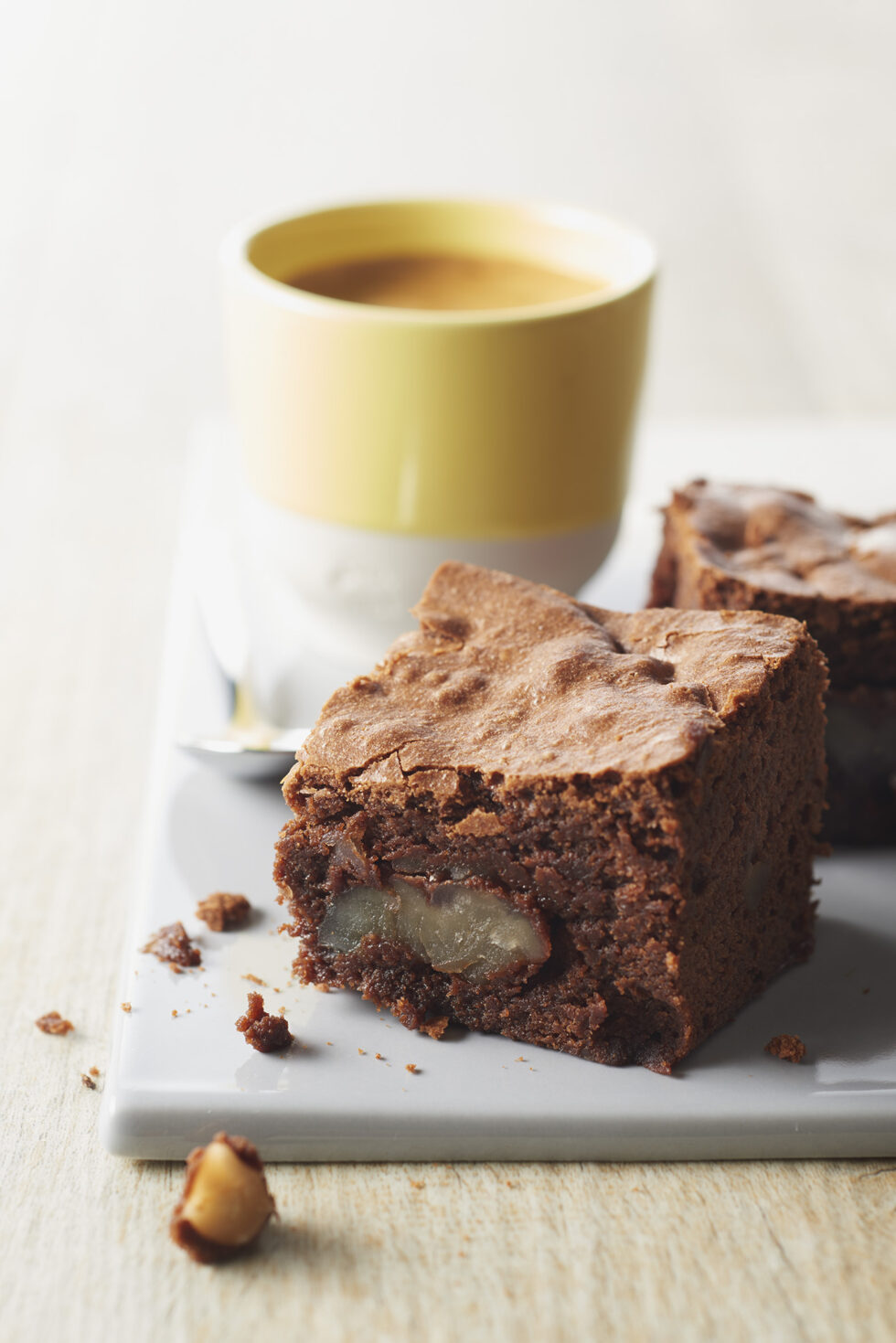 75 g de pâte de marrons Sabaton, 100 g de châtaignes au sirop, 60 g de noisettes, 200 g de chocolat noir à pâtisser, 100 g de beurre, 4 œufs, 100 g de sucre en poudre, 60 g de farine.