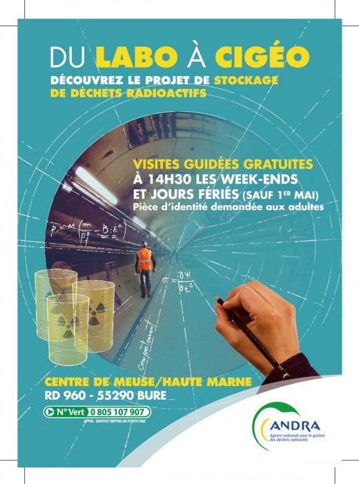 Pour rendre ce projet accessible au grand public, l’Andra propose des visites guidées, les week-ends, à partir de 14h30. Au programme : un exposé sur le projet, un parcours dans une halle technologique où sont présentés des prototypes de conteneurs de déchets et des robots développés pour Cigéo puis une découverte d’une reconstitution de galerie où sont simulées des expériences scientifiques et techniques réalisées dans le laboratoire souterrain.