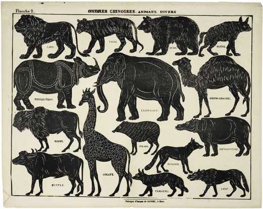 Dès 1840, les imageries de l’Est de la France éditent des séries de feuilles d’ombres chinoises et prolongent ainsi la mode parisienne des spectacles de théâtres d’ombres du Séraphin. À découper puis à jouer dans un théâtre familial, elles reprennent les pièces à succès parisiennes. Du « Carnaval de Paris » où les personnages défilent jusqu’aux petites pièces burlesques, « La marchande de marée » ou « Le pâté d’oie », elles racontent les goûts et les sujets d’amusements du 19e siècle.