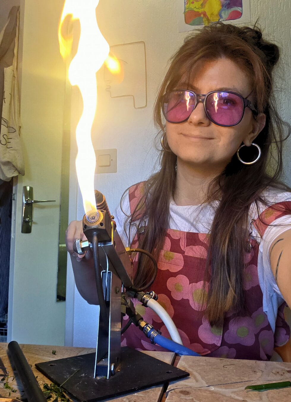 Le programme de formation est pensé de manière progressive. Les premiers jours sont consacrés à la prise en main de l’atelier, la découverte des différents types de verre (sodocalcique, borosilicate) et l’apprentissage des gestes de base, comme la création de feuillages texturés ou l’ajout de décor.