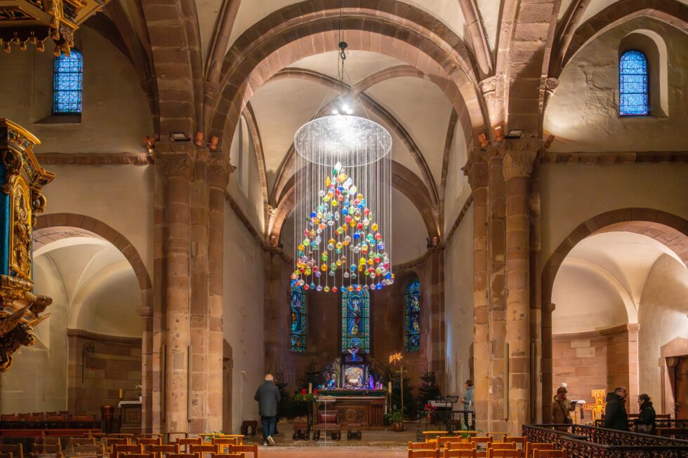 Admirez ce lustre composé de 173 boules de Noël en verre de Meisenthal ! En contrepoint des vitraux de l’église, il crée une suspension originale que la lumière vient animer. Du 22 novembre au 4 janvier.