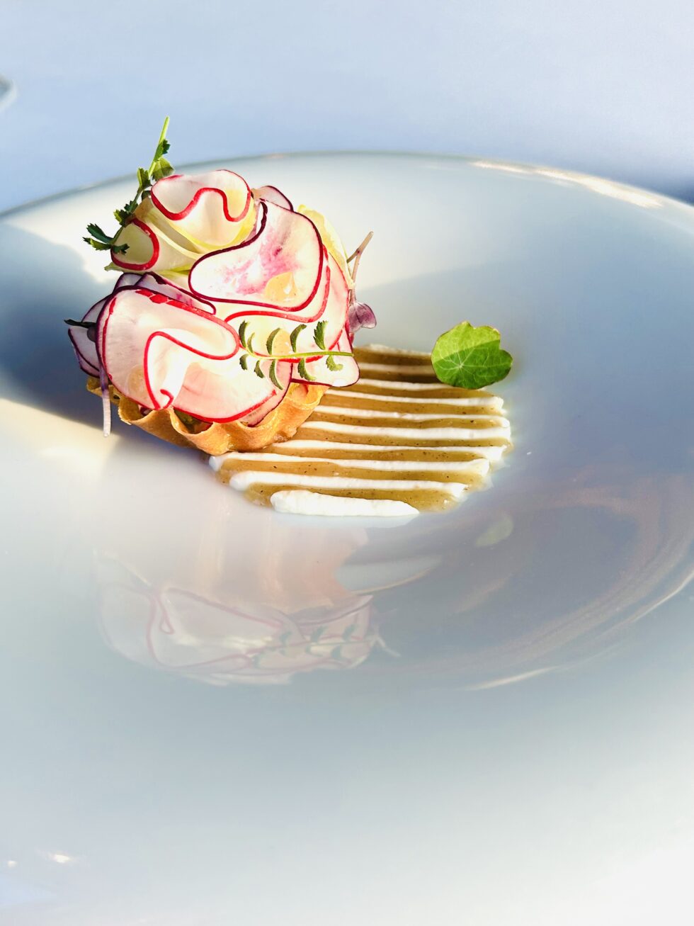 Elle est arrivée à une bonne période de ma vie. J’étais jeune papa et je souhaitais retrouver la Moselle. Mon parcours y a commencé, à La Citadelle à Metz, puis la Grande cascade à Paris, Le Château d’Adoménil en Meurthe-et-Moselle avant de mettre le cap vers un 2* Michelin dans le sud de la France. La rencontre avec Alexandre a été décisive et a permis de fermer la boucle. En échangeant, nous avons très vite partagé cette envie commune de construire une table de référence, dans un lieu atypique avec de beaux produits. La page était blanche, tout écrire était un challenge excitant.